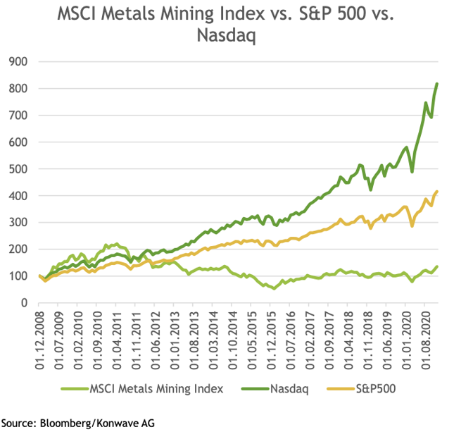 En raison de cette sous-évaluation massive, nous nous attendons à ce que les investisseurs prennent leurs bénéfices sur les actions de croissance, principalement les sociétés technologiques qui ont évidemment bénéficié des taux d’intérêt et d’inflation très bas, pour les réallouer en actifs comparativement bon marché comme les matières premières, les métaux et les actions minières.