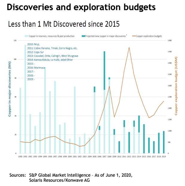 Le cuivre est le plus grand marché, et de nombreux métaux, tels que le nickel, présentent un profil de découverte de nouveaux gisements et de budgets d’exploration similaire. Si de nombreux nouveaux gisements ont été découverts dans les années 1990 malgré des budgets d’exploration faibles, dès 2000, malgré des budgets d’exploration en augmentation, les découvertes ont commencé à baisser en moyenne. Il y a eu très peu de découvertes de cuivre au cours des 11 dernières années, et ce malgré l’augmentation massive de l’exploration en 2009, 2010 et 2011. Depuis 2015, un seul nouveau gisement de cuivre a été trouvé. Or les besoins en cuivre augmentent en parallèle. Et si à court terme quelques nouvelles mines devraient être mises en activité (au Congo, aux États-Unis et au Chili) et que les productions de mines existantes devraient être stimulées par des prix élevés, la demande augmente elle aussi, à un rythme soutenu depuis 50 ans de deux fois le taux de croissance du PIB, afin de combler les besoins en électrification des pays en voie de développement. A ces besoins, viennent désormais s’ajouter la demande liée aux véhicules électriques et à l’énergie verte. Quel que soit le scénario retenu, l’écart à combler reste donc important. Selon Wood Mackenzie, cet écart représente la production d’environ 100 mines de cuivre de taille moyenne à grande. Or les gisements de cuivre connus et inexploités se comptent aujourd’hui sur les doigts de la main et les stocks représentent que quelques jours de consommation.